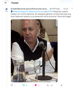 Ushuaia, miércoles 21 de junio de 2023.- “Es necesario generar condiciones para que todo mejore en relación a la prevención de la tortura en Tierra del Fuego”, dijo el legislador Pablo Villegas (MPF), ante los integrantes del Consejo Federal para la Prevención de la Tortura, que se reunió el 14 y 15 de junio en San Juan, en el marco del Consejo Federal de Mecanismos Locales.
